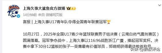 北京时间10月28日,根据上海男篮官方社媒发文公示,2025年全国U17青少年篮球联赛男子组决赛圆满落幕。冠军争夺战中,上海久事以116:96战胜浙江广厦,捧起冠军奖杯。